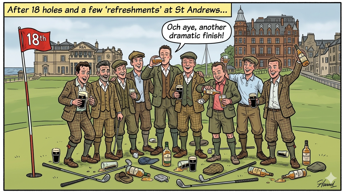 Wheels up from various locations, landing in Edinburgh between 0805 & 0940, excitement buzzing in the cabin.Lunch awaits at The Ship Inn, Elie— waves crashing, sea air filling our lungs, pints in hand as the anticipation builds.1500, the firstfourballs get going, Chaps vs Masters, on the links of Elie Golf Club — a quirky gem that stirs the soul with its seaside charm and blind shots that test nerve and imagination.After the final putt drops, we travel to The 19th for a post round pint, or just hot foot it to the spiritual home of golf: St Andrews.2000, we depart Elie for St Andrews & the Rusacks Hotel — overlooking the 18th on the Old Course, steeped in golfing lore.